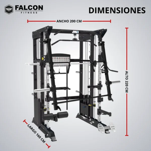 La Jaula Smith Machine Titán es perfecta para quienes buscan una multifuncional completa y segura, que permita hacer variedad de rutinas en un mismo lugar ya sea en un gimnasio o en el hogar. La Titán ofrece diferentes aditamentos como agarres crossover, plataforma para remo, estructura de dominadas, asiento para jalón, poleas ajustables entre otros. Esta multi gym ayuda a ahorra tiempo y esfuerzo ya que es fácil de usar y de adaptar a tus objetivos de entrenamiento, por lo que podrás fortalecer todos los músculos de tu cuerpo, subiendo progresivamente la resistencia con sus dos pilas de peso integrado individuales por lado.