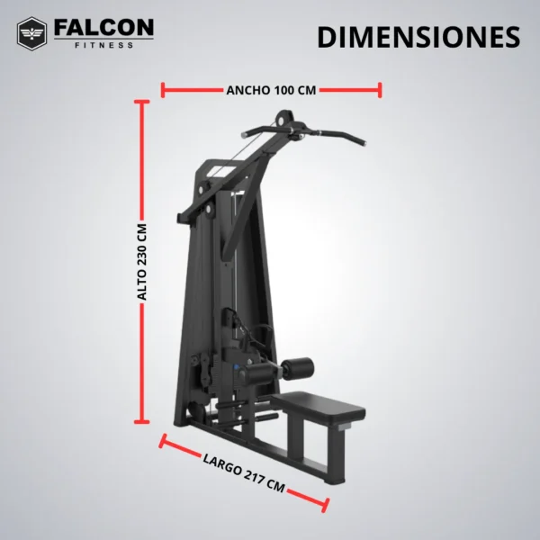 Esta máquina permite realizar ejercicios de jalón para trabajar los músculos de la espalda de manera efectiva, ayudando a mejorar la fuerza y definición del dorsal y los hombros con un movimiento controlado.